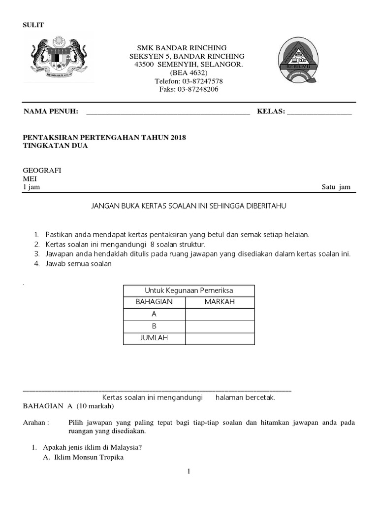 Bank Soalan Peperiksaan Pertengahan Tahun 2018 Kssm Tingkatan 1
